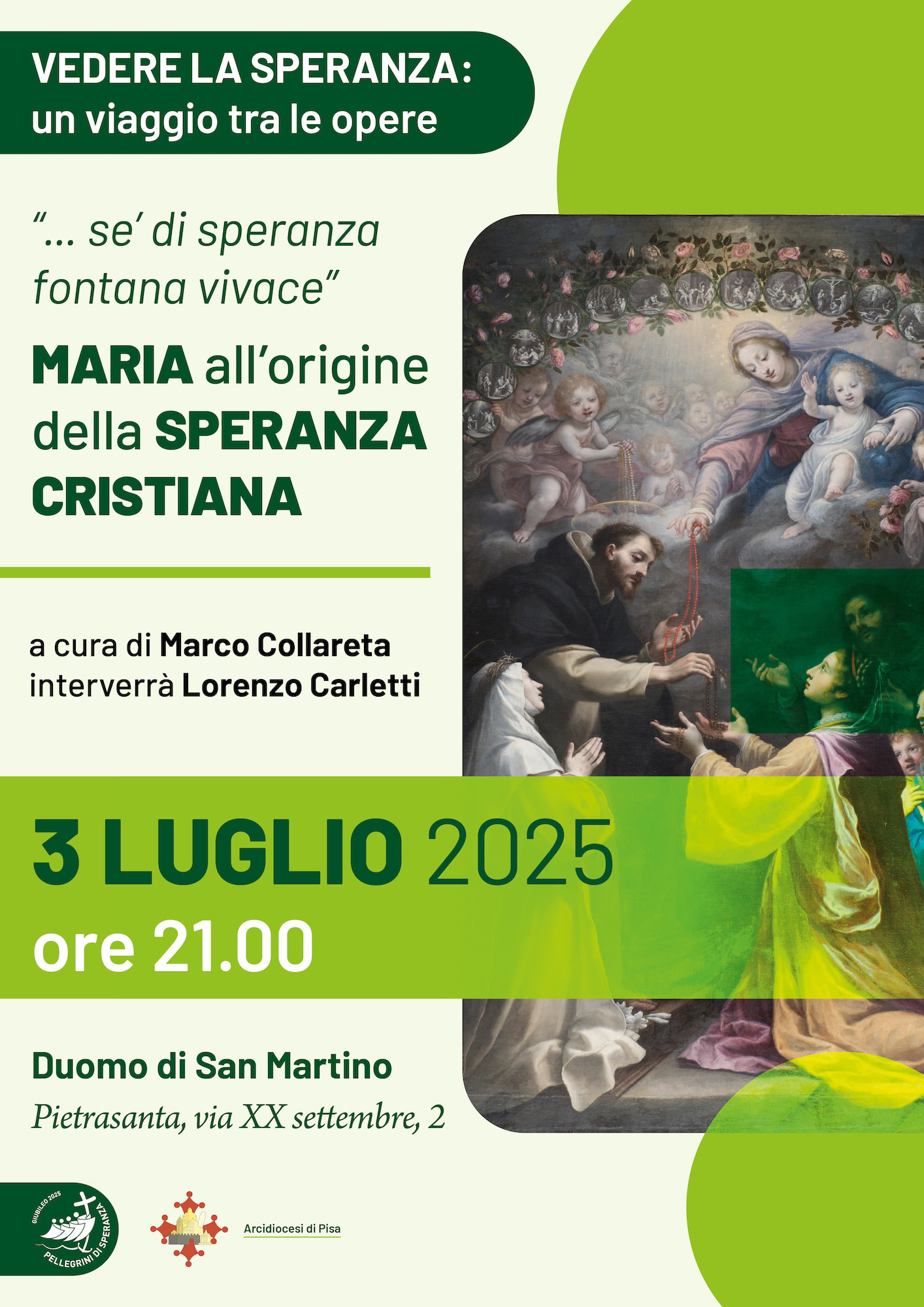 Per il ciclo ‘Vedere la Speranza: un viaggio tra le opere’, il prossimo appuntamento si terrà nella serata di giovedì 3 luglio nel Duomo di San Martino a Pietrasanta, dove Lorenzo Carletti parlerà del tema mariano all’origine della speranza cristiana, di fronte al dipinto di Matteo Rosselli raffigurante la “Madonna del Rosario”. L’intervento sarà preceduto da una riflessione di Marco Collareta, che introdurrà alla conferenza con un percorso iconografico dedicato alla raffigurazione della Speranza nel tempo.